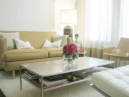 La alfombra es muy importante, busca una no muy grande para delimitar una zona, si la puedes colocar en ángulo debajo de la mesa del café, te cambiará la habitación.